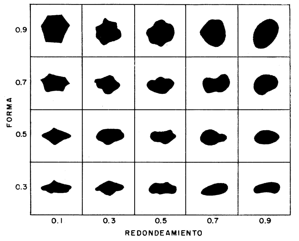 Índice de forma e índice de redondez o redondeamiento (original de Krumein & Sloss, consultado en http://materias.fi.uba.ar/6408/santamarina2.pdf)